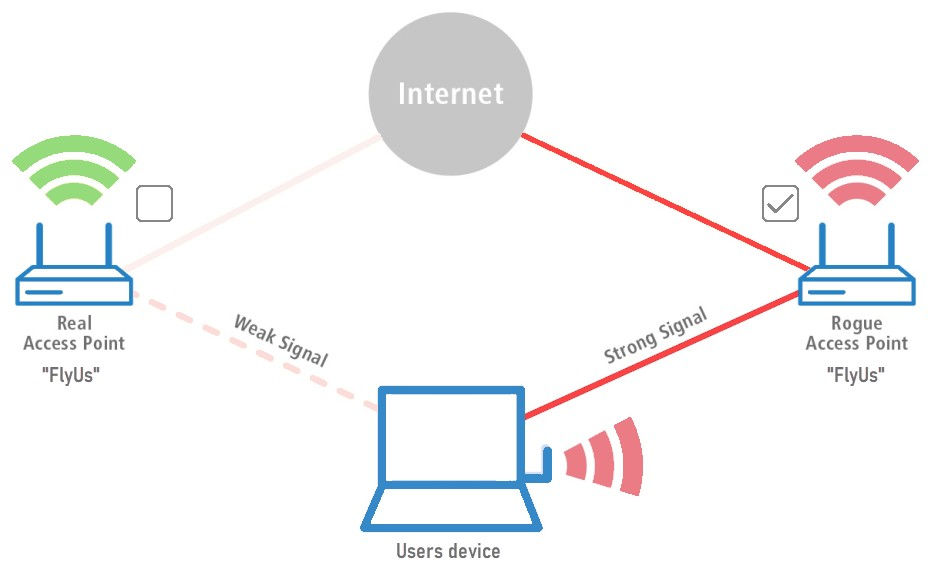 Un Rogue Access point est un point d’accès sauvage, souvent non autorisé et malveillant. Il va principalement être mis en place pour voler des informations aux utilisateurs s’y connectant.
